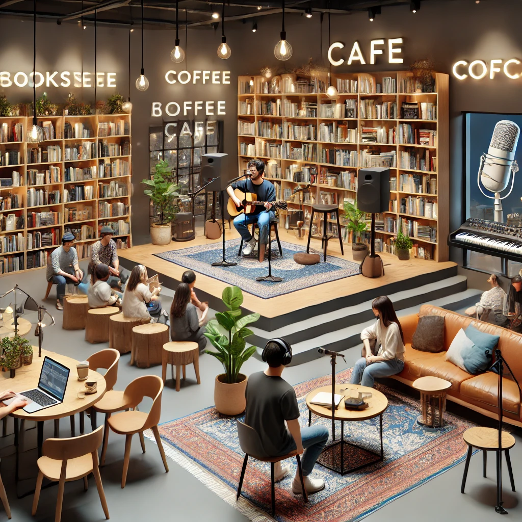 📌 4. 북카페 + 라이브 공연장 + 팟캐스트 녹음 부스 – ‘책과 음악의 공간’