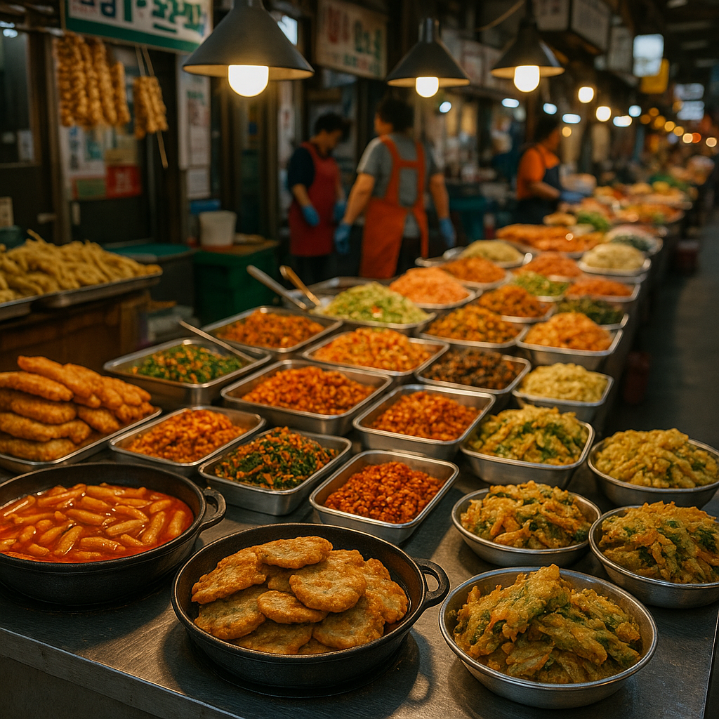 - 사진 팁: 시장 노점의 화려한 음식 진열 장면