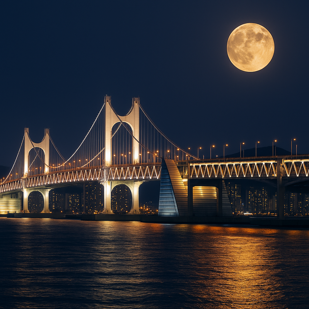 부산의 상징 광안대교는 낮에는 푸른 바다와 조화를 이루고, 밤에는 형형색색의 조명으로 장관을 이룹니다. 추석 보름달이 뜨는 날에는 바다와 다리 위 달빛이 어우러져 더욱 낭만적인 풍경을 선사합니다.